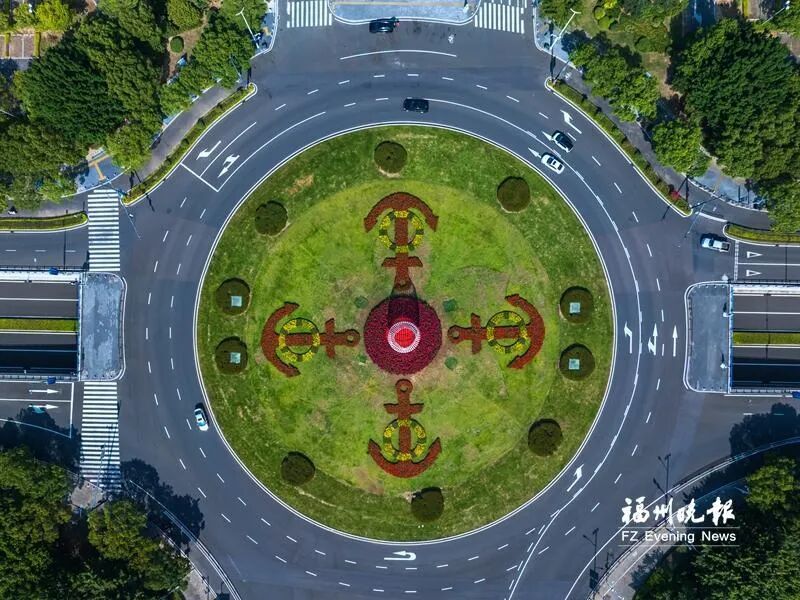 会展岛圆盘的花化布置是盛会期间福州的一大看点,圆盘的花化布置采用与大会相契合的“船锚”创意,通过龙船花、一串红、百日草等在圆盘的4个方向各打造一个“船锚”,圆盘中心点由鲜艳的三角梅“坐镇”,进一步烘托盛会的热烈氛围。