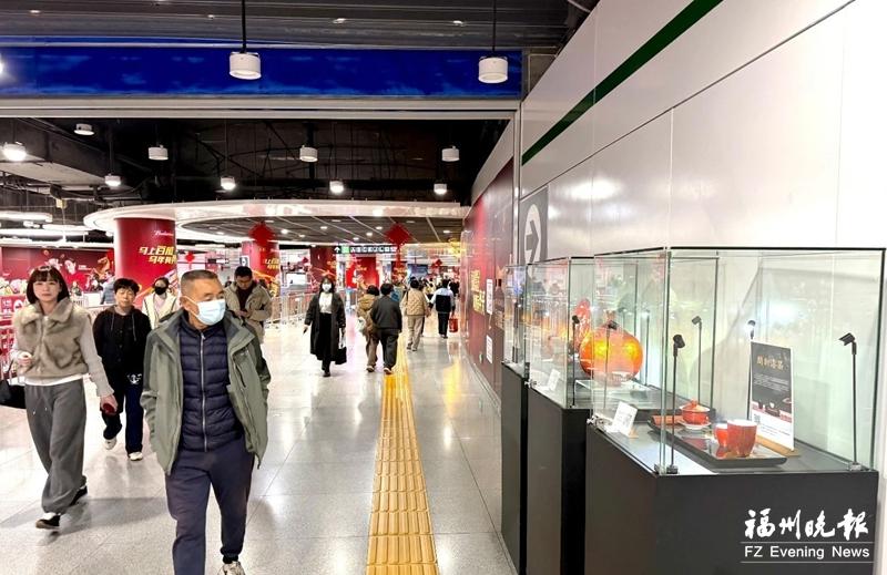 春运期间,福州地铁在滨海快线福州火车站站、闽都站、南公园站、机场站,2号线南门兜站、鼓山站,以及4号线东街口站等重点车站布设了非遗主题展柜,让市民游客在出行途中邂逅福州非遗之美。
