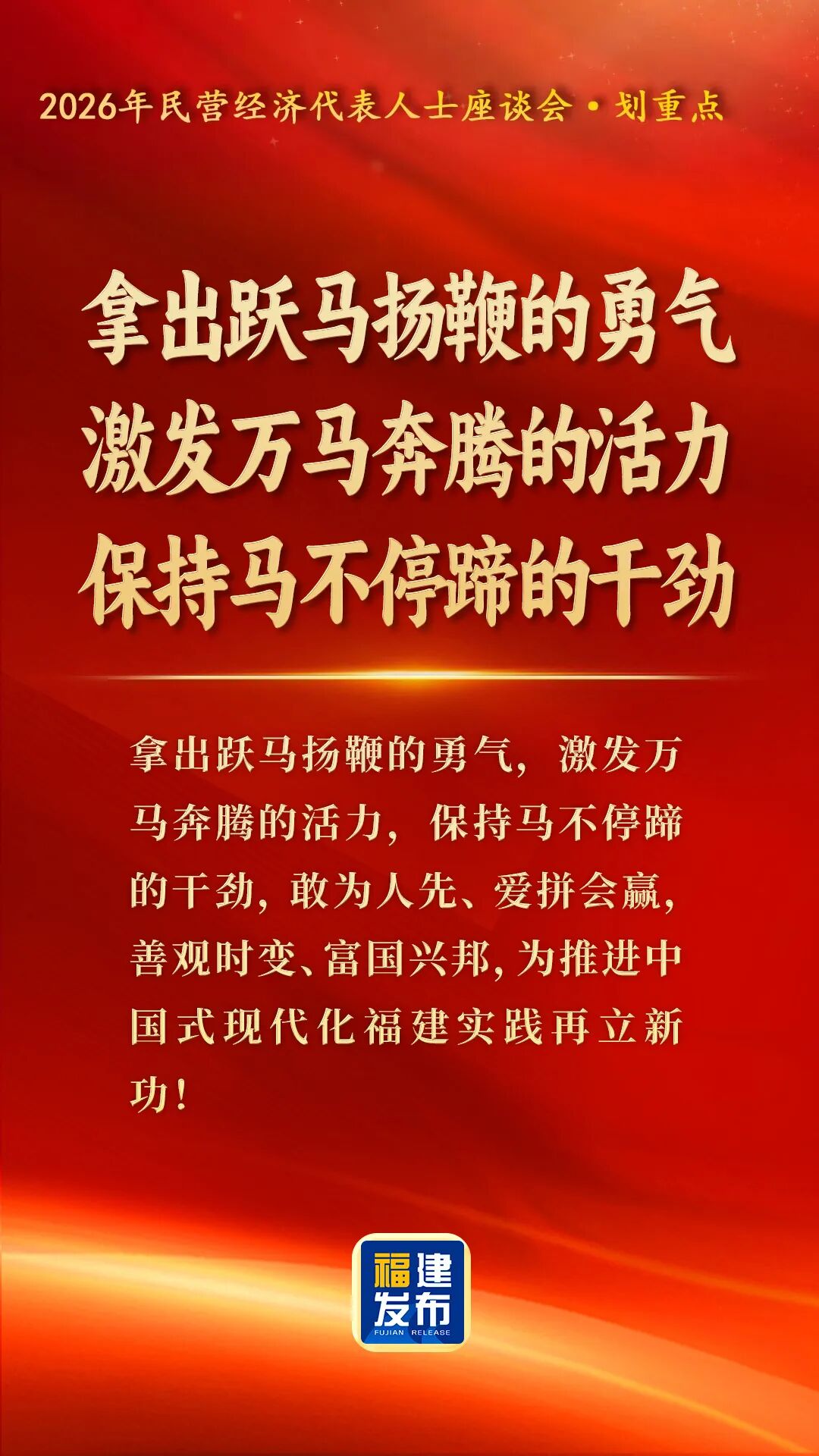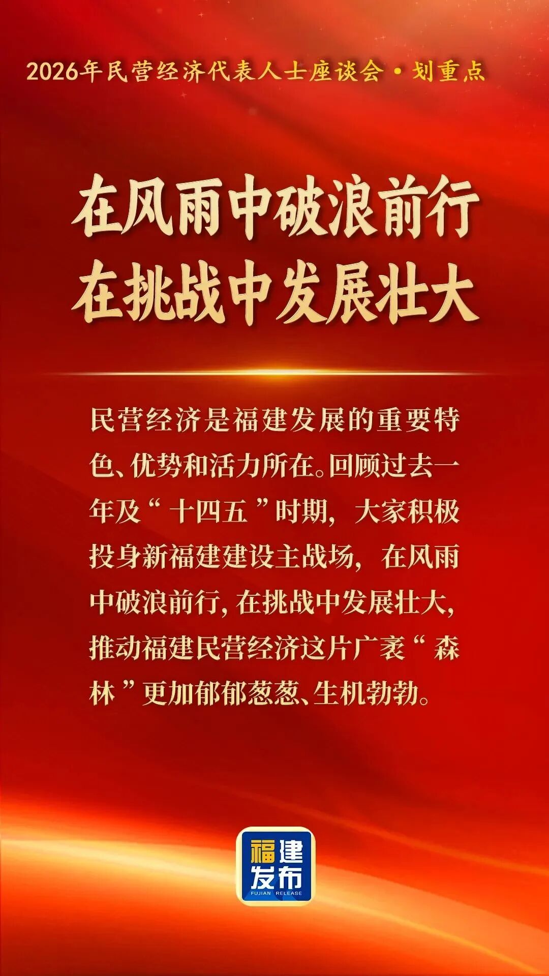 丙午马年开假第一天,2月24日,省委、省政府连续第六年以“新春第一会”形式,在福州召开民营经济代表人士座谈会。会上,省领导与民营企业家共同学习贯彻习近平总书记关于民营经济发展的重要论述,研究促进民营经济健康发展、高质量发展,激发“开局起势”的强大动力,以旗帜鲜明的态度、真真切切的尊重和实实在在的举措,鼓励和支持全省广大民营企业和民营企业家坚定信心、振奋精神、奋勇争先,为实现“十五五”良好开局、奋力谱写新征程新福建建设新篇章作出新的贡献。省委书记、省人大常委会主任周祖翼出席并讲话,省委副书记、省长赵龙主持。省政协主席滕佳材,省委副书记、福州市委书记郭宁宁出席。