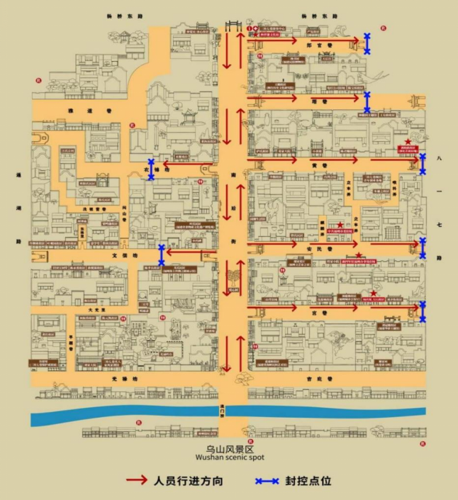在管控时间内,三坊七巷街区东西方向的所有巷口将采取“只出不进”的临时管控措施,届时,请市民游客统一从以下两个主入口进入街区: