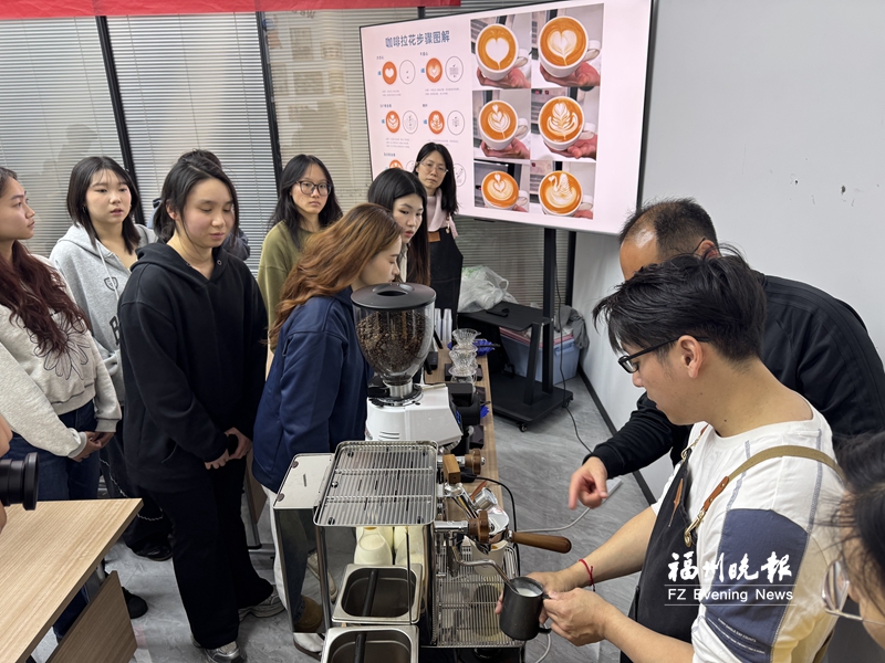 最受期待的当属咖啡拉花体验环节。台湾青年郭屹凡现场分享咖啡文化。从咖啡产区与风味的理论科普,到手冲、拉花的实操教学,大家分组轮换、沉浸式学习。