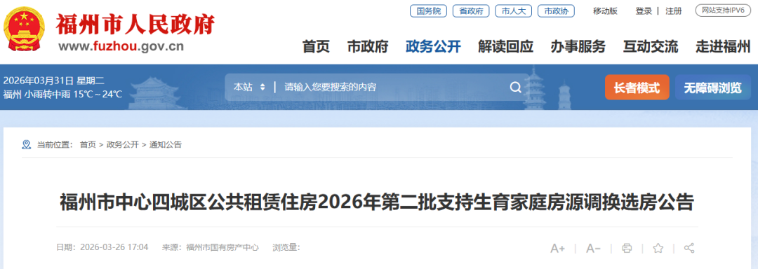 其中,在住房保障方面,福州面向市中心四城区符合公租房保障条件的家庭,因生育人口需改善居住条件的,提供公租房房源调换服务,助力保障家庭“住有宜居”。