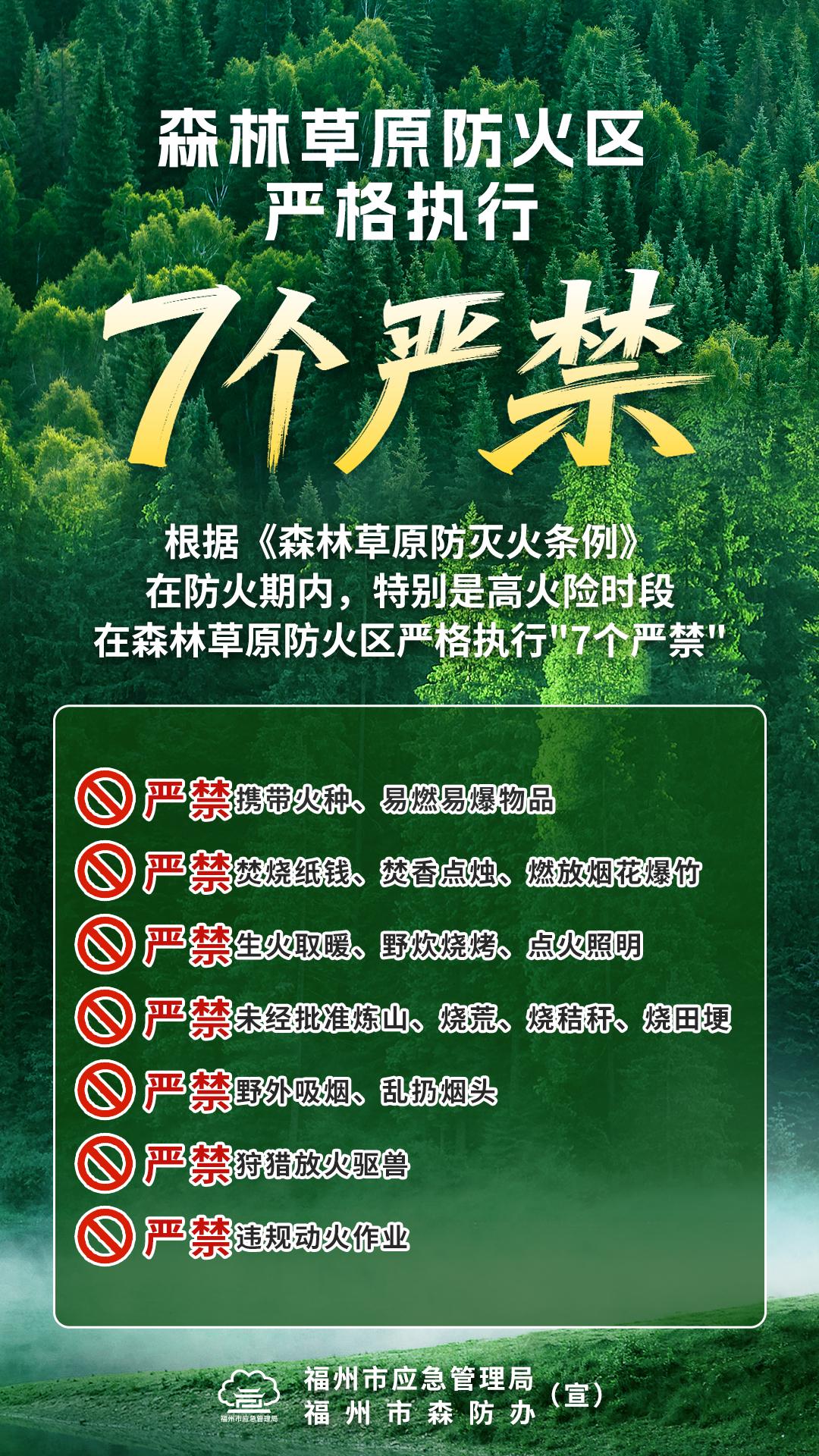 福州市森防办强调,广大市民应严守防火规定,践行文明祭扫,森林草原防火区严格执行“7个严禁”:严禁携带火种、易燃易爆物品;严禁焚烧纸钱、焚香点烛、燃放烟花爆竹;严禁生火取暖、野炊烧烤、点火照明;严禁未经批准炼山、烧荒、烧秸秆、烧田埂;严禁野外吸烟、乱扔烟头;严禁狩猎放火驱兽;严禁违规动火作业。