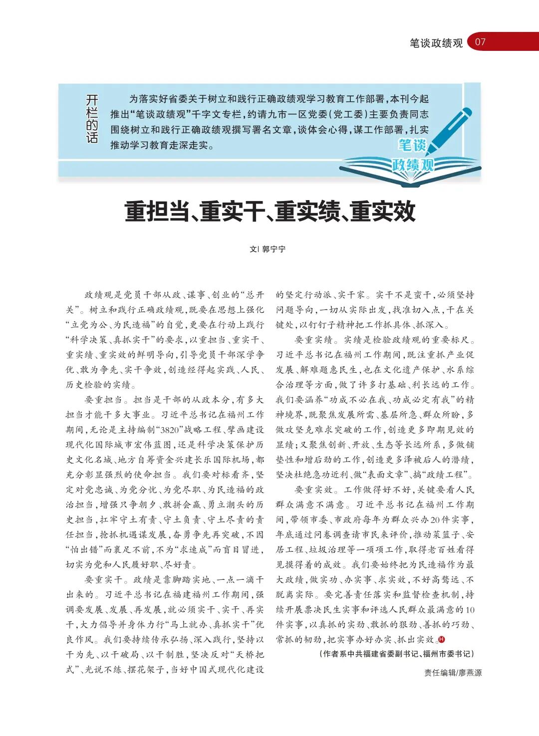 为落实好省委关于树立和践行正确政绩观学习教育工作部署,《海峡通讯》今起推出“笔谈政绩观”千字文专栏,约请九市一区党委(党工委)主要负责同志围绕树立和践行正确政绩观撰写署名文章,谈体会心得,谋工作部署,扎实推动学习教育走深走实。