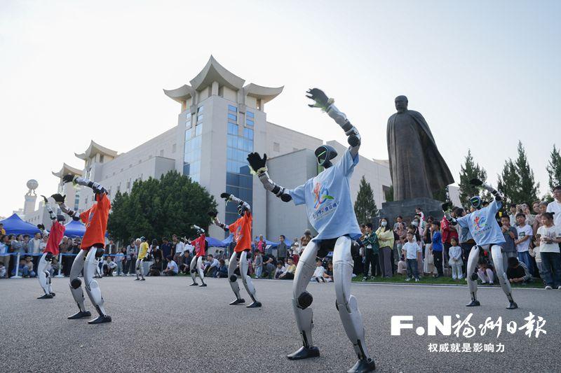 25日,在福建博物院广场,随着音乐响起,10台银白色机器人整齐列队,跟随节拍精准卡点、灵活摆臂,引得围观市民连连惊叹,不少人举起手机记录这一充满未来感的瞬间。